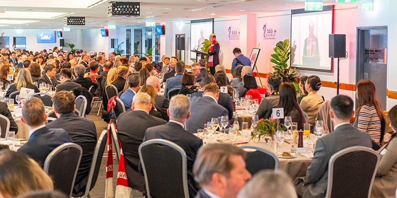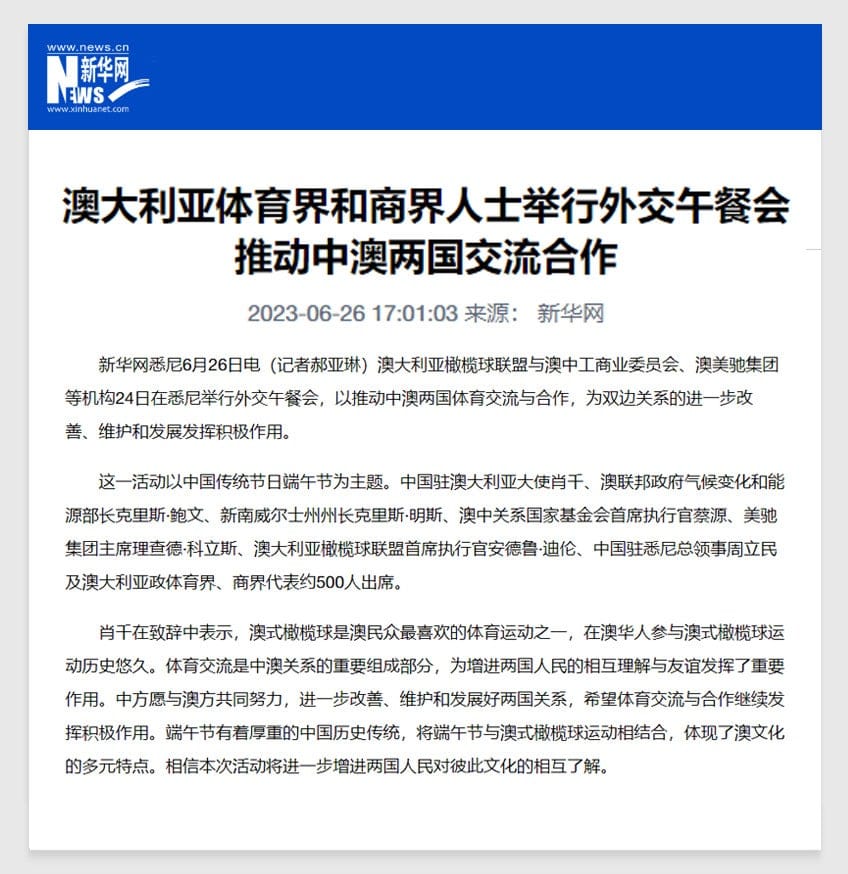中华人民共和国驻澳大利亚联邦特命全权大使肖千应邀出席并发表主旨演讲。中国驻悉尼总领事周立民、新南威尔士州州长Chris Minns(克里斯·明斯)、澳大利亚联邦气候变化和能源部长Chris Bowen(克里斯·鲍文)、澳中关系国家基金会CEO蔡源、澳式橄榄球联盟(AFL)CEO Andrew Dillon(安德鲁·迪伦)、悉尼天鹅队主席普利德姆及中澳政商界精英代表约500名嘉宾出席。