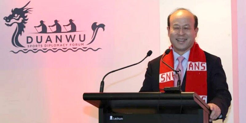 肖千大使在致辞中表示,澳式橄榄球是澳民众最喜欢的体育运动之一,在澳华人参与澳式橄榄球运动历史悠久。体育交流是中澳关系的重要组成部分,为增进两国人民的相互理解与友谊发挥了重要作用。去年以来,在双方共同努力下,两国关系企稳向好。今年以来,两国各领域各层级对话交流不断增多。中方愿与澳方共同努力,进一步改善、维护和发展好两国关系,希望体育交流与合作继续发挥积极作用。端午节有着厚重的中国历史传统,将端午节与AFL比赛相结合,体现了澳文化的多元特点。相信本次活动将进一步增进两国人民对彼此文化的相互了解。