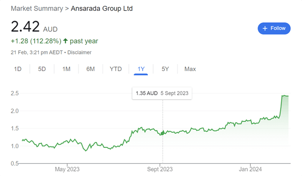 龙年伊始,MA美驰澳大利亚风投投资项目 Ansarada(数据库服务软件服务商)获得收购要约。Datasite(美国数据提供商)提出以每股2.5澳元价格,总值2.4亿澳元现金收购 Ansarada。截至2024年2月21日,Ansarada股价为2.42澳元,过去12个月增长112.28%。