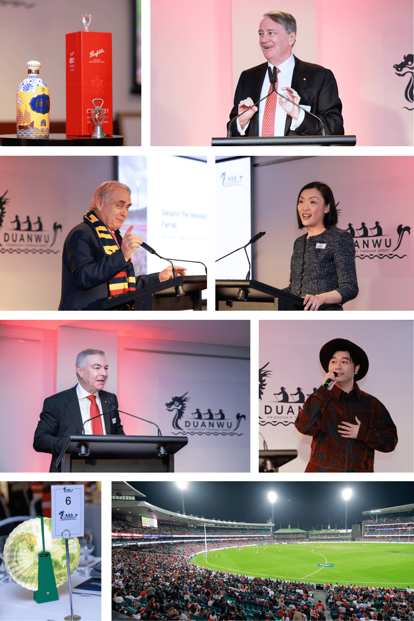 澳大利亚总督Sam Mostyn AC 阁下、中国驻澳大利亚联邦特命全权大使肖千阁下、澳大利亚贸易部长Don Farrell阁下、 前澳大利亚贸易和旅游部长Warwick Smith AO 阁下出席本次活动并发表主旨演讲。活动得到了包括新南威尔士州政府(NSW Government)、澳中关系研究学院(ACRI)、悉尼发展委员会(Committee for Sydney)、澳大利亚大学联盟(Universities Australia)在内的合作伙伴鼎立支持。中澳政商体界精英代表近400名嘉宾出席贵宾晚宴,并与现场约48,000名观众共同观看悉尼天鹅队主场迎战Adelaide Crows队的比赛。