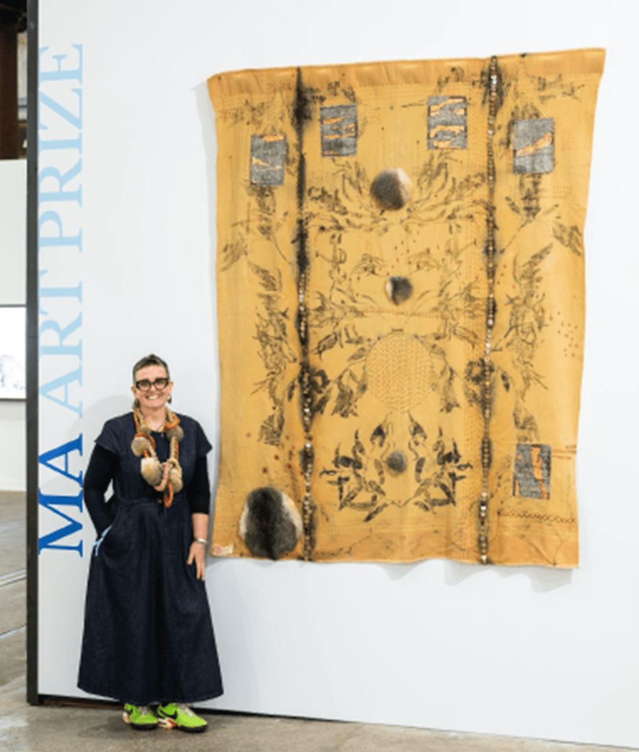 在 2025 年度评选中,来自 Wagga Wagga 地区,拥有澳洲原住民 Gamilaraay 血统的艺术家 Juanita McLauchlan 脱颖而出,荣获该奖项。她的获奖作品 《Mandaymanday / String of Stars(星光之联)》 将澳洲本土与原住民传统材料相融合,以强烈的艺术张力呈现出 Wagga Wagga 的 Wiradjuri 领地,Juanita通过其鲜明浓郁的艺术风格凸显了跨越世代的血脉与文化传承,深刻展现了艺术家与故土之间的深厚情感与精神联系。