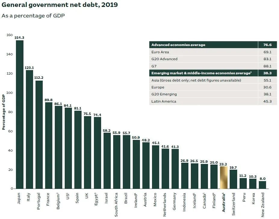 2020年4月发布的《全球财政监测报告》中表示澳大利亚政府在2019的净债务占全年GDP比重的23%,这一比例远低于全球发达经济体的平均水平。管理高效的政府债务水平对于后疫情时代的经济复苏起到举足轻重的作用。
