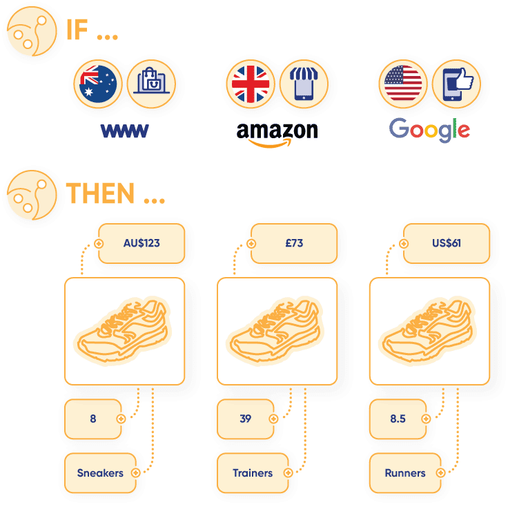 例如澳大利亚客户通过亚马逊(销售渠道)搜索运动鞋,搜索引擎通过抓取此客户所在地自动转化货币单位至澳币(自动化)及产品描述,推送品牌客户的运动鞋产品(算法过滤),最大程度提高营销率。