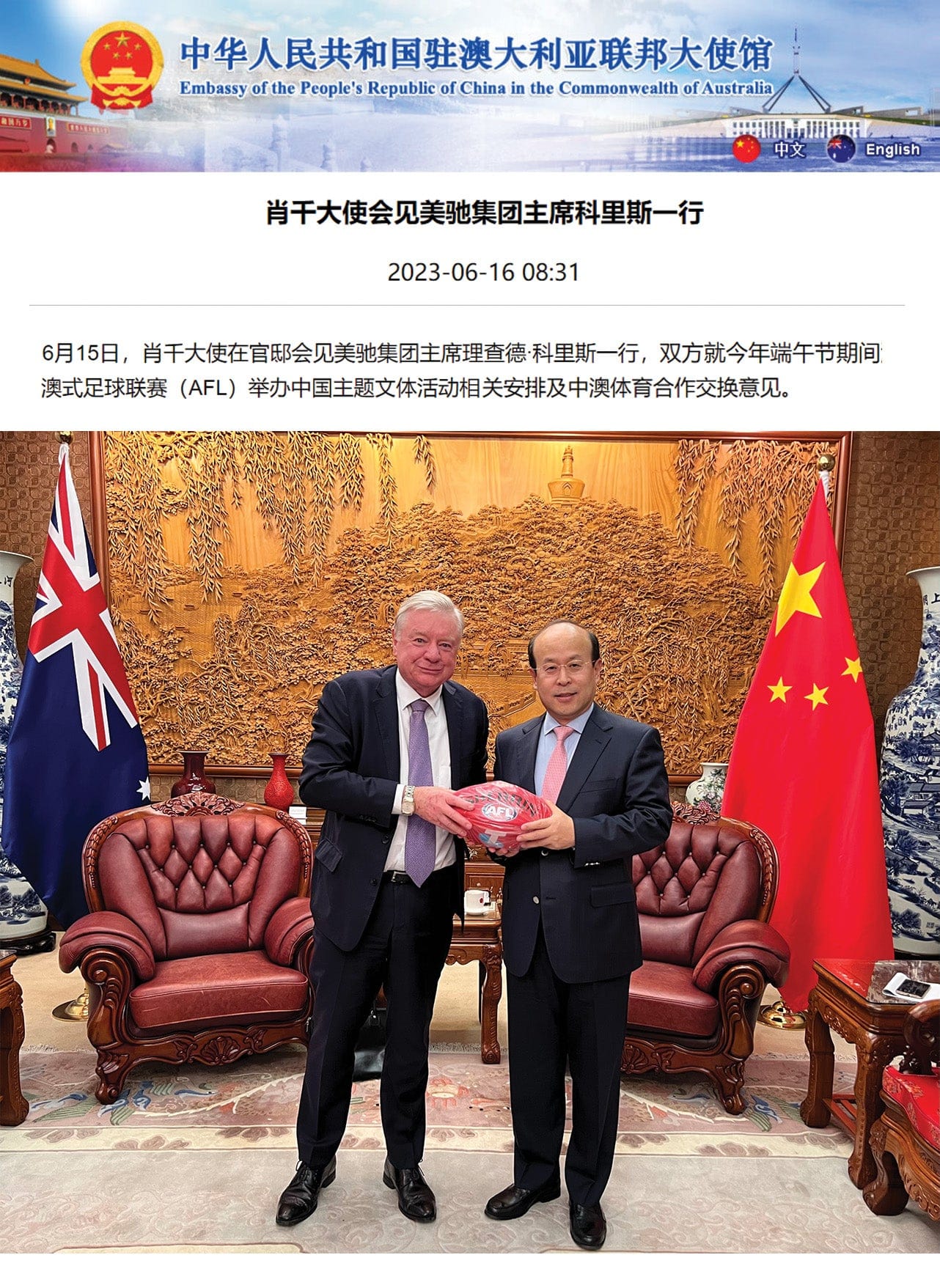 美驰澳大利亚资产管理部主席,前悉尼天鹅队主席Richard Colless先生于6月15日拜会肖千大使,就本活动相关安排及中澳体育合作交换意见。截图源自中国驻澳大利亚大使馆官网微信号。
